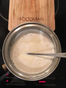 - 2 lingurițe încălziți laptele pe aragaz, dar nu lăsați la fiert. laptele fierbinte adaugă masa rezultată. Amestecați constant și Aduceți crema la consistența cremoasă dorită.