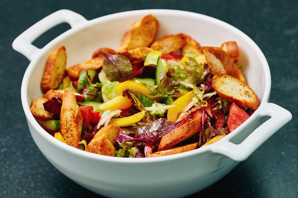 În doar 25 de minute îmi propun să gătesc acasă foarte gustos și salată de legume ușoare cu crutoane. Crutoanele pot fi făcute atât din baguette și din obișnuitul pușcaș.